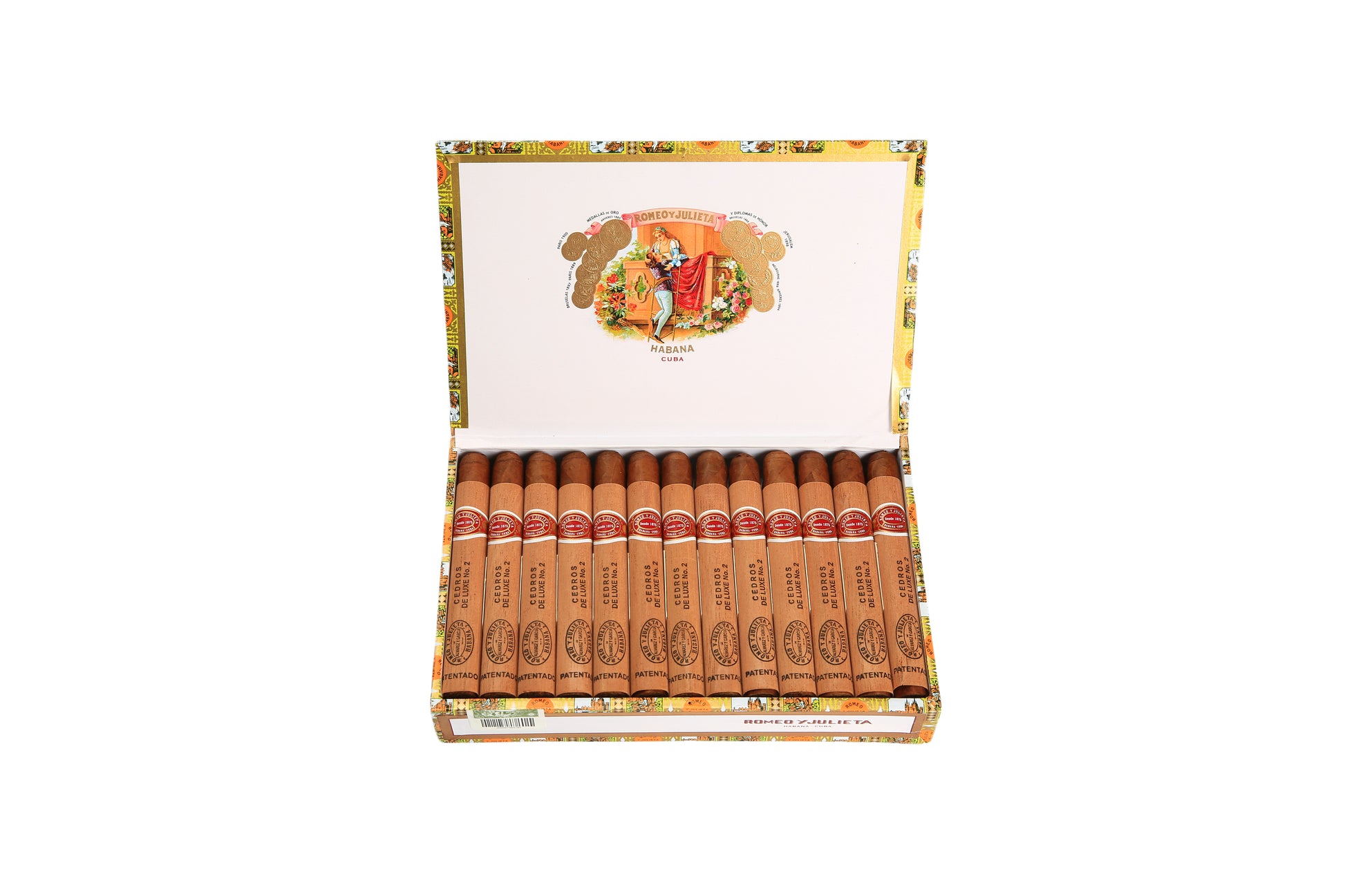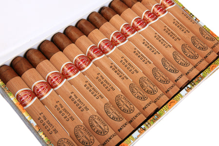 25 cigars rolled in cedar wood chips in a paper-covered wooden box.